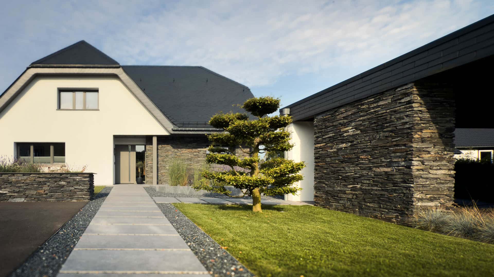 Das bestehende Wohnhaus erstrahlt nach dem Umbau in neuer Harmonie: Charaktervolle Bruchsteine treffen auf klaren weißen Putz und edlen Naturschiefer – ein Zusammenspiel, das zeitlose Eleganz ausstrahlt.