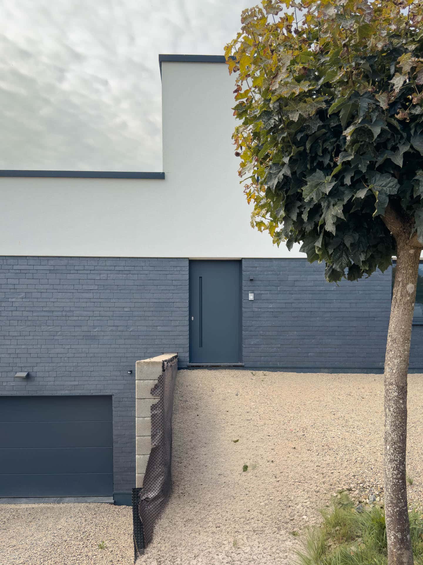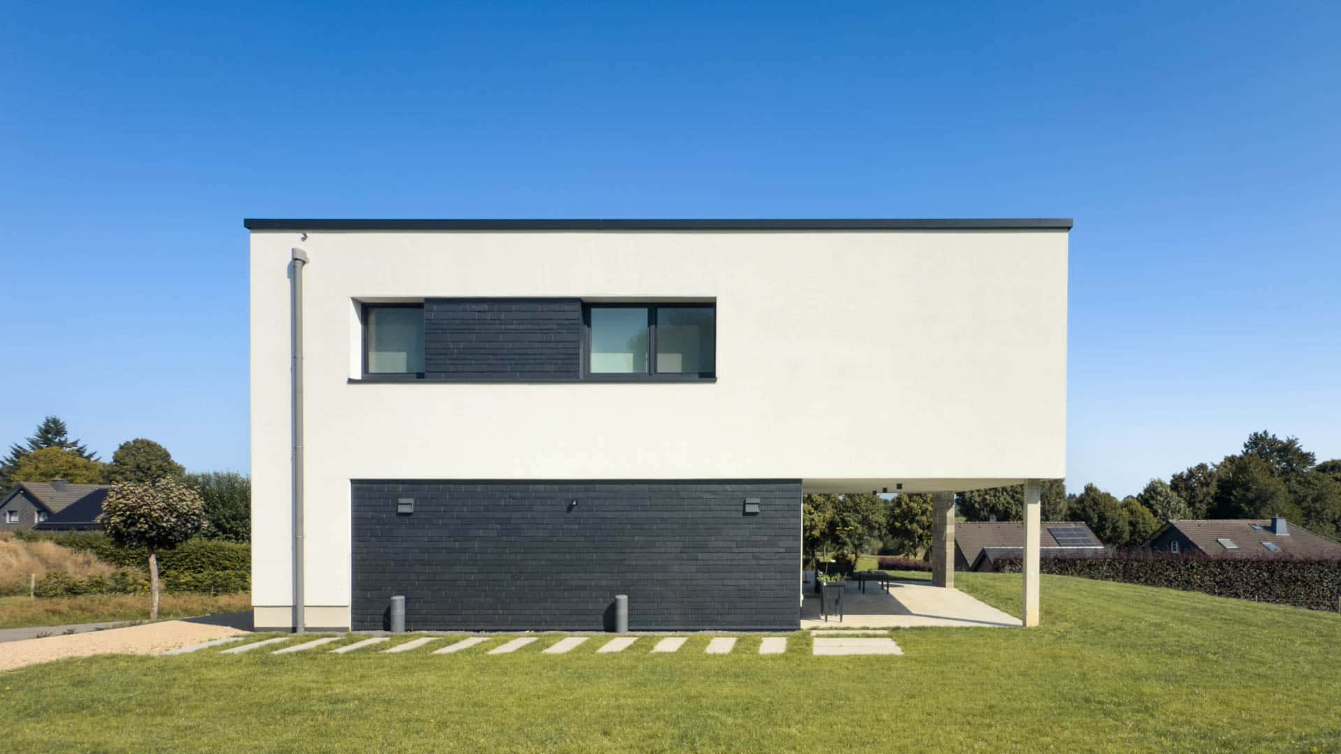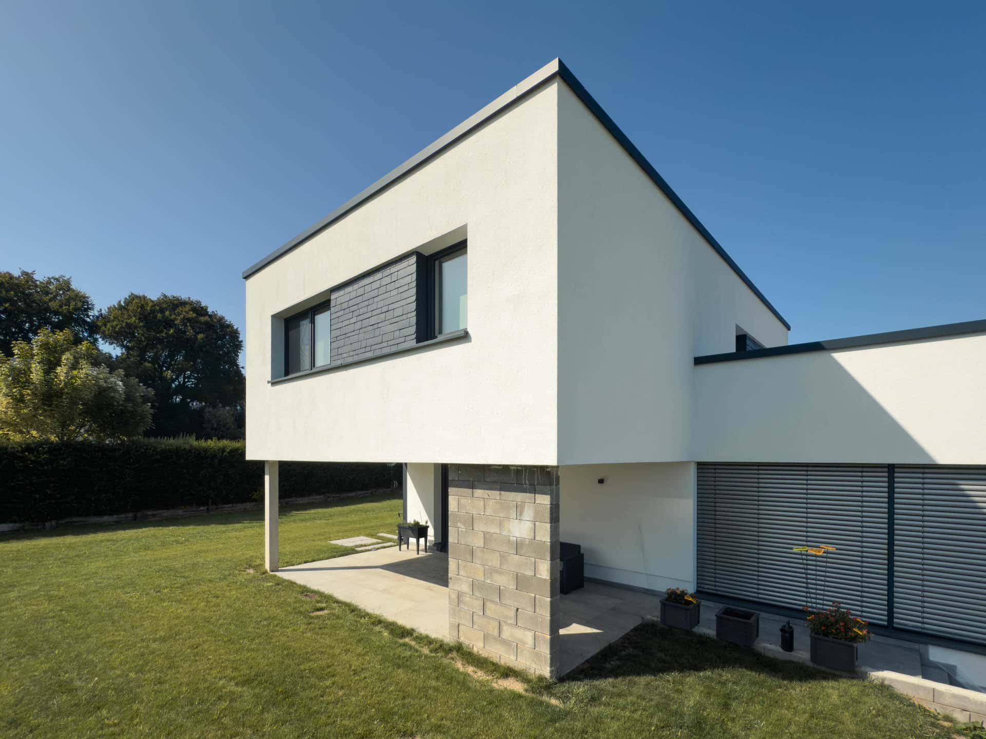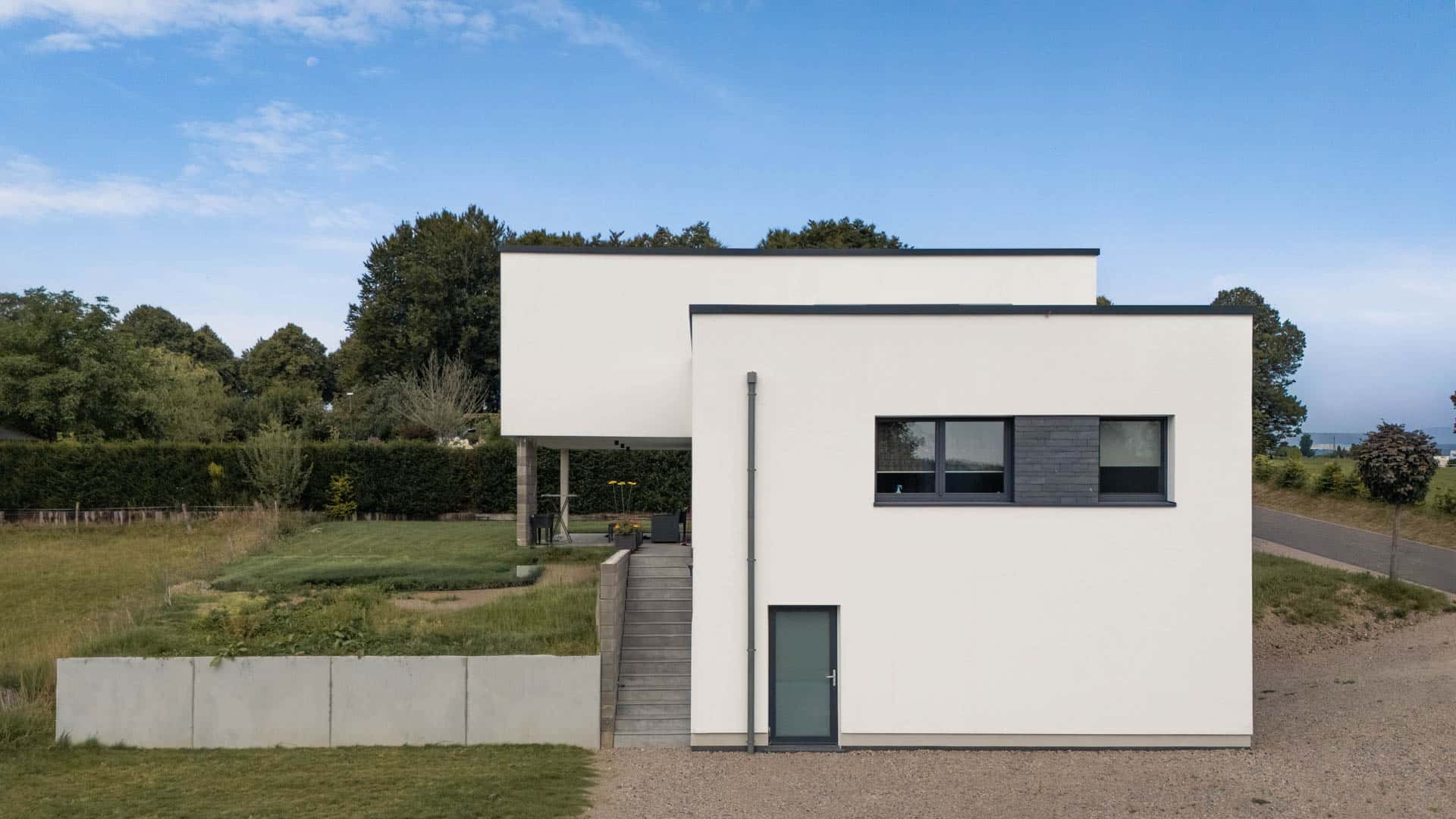 Das Wohnhaus fügt sich elegant in das steile Gelände ein. Garage und Haupteingang sind im Unter- bzw. Erdgeschoss positioniert und werden jeweils von einer klar konturierten, weiß verputzten Fläche gerahmt, sodass das Gebäude nicht als drei Etagen hoch wahrgenommen wird. Klare Kanten treffen präzise aufeinander, die Volumen sind sauber strukturiert und perfekt aufeinander abgestimmt. Die großzügig verglaste Rückfassade lässt viel Südwestlicht in die Wohnräume, während das versetzte Obergeschoss zugleich eine überdachte Terrasse schafft, die vor Regen schützt und das Innere vor Überhitzung bewahrt.