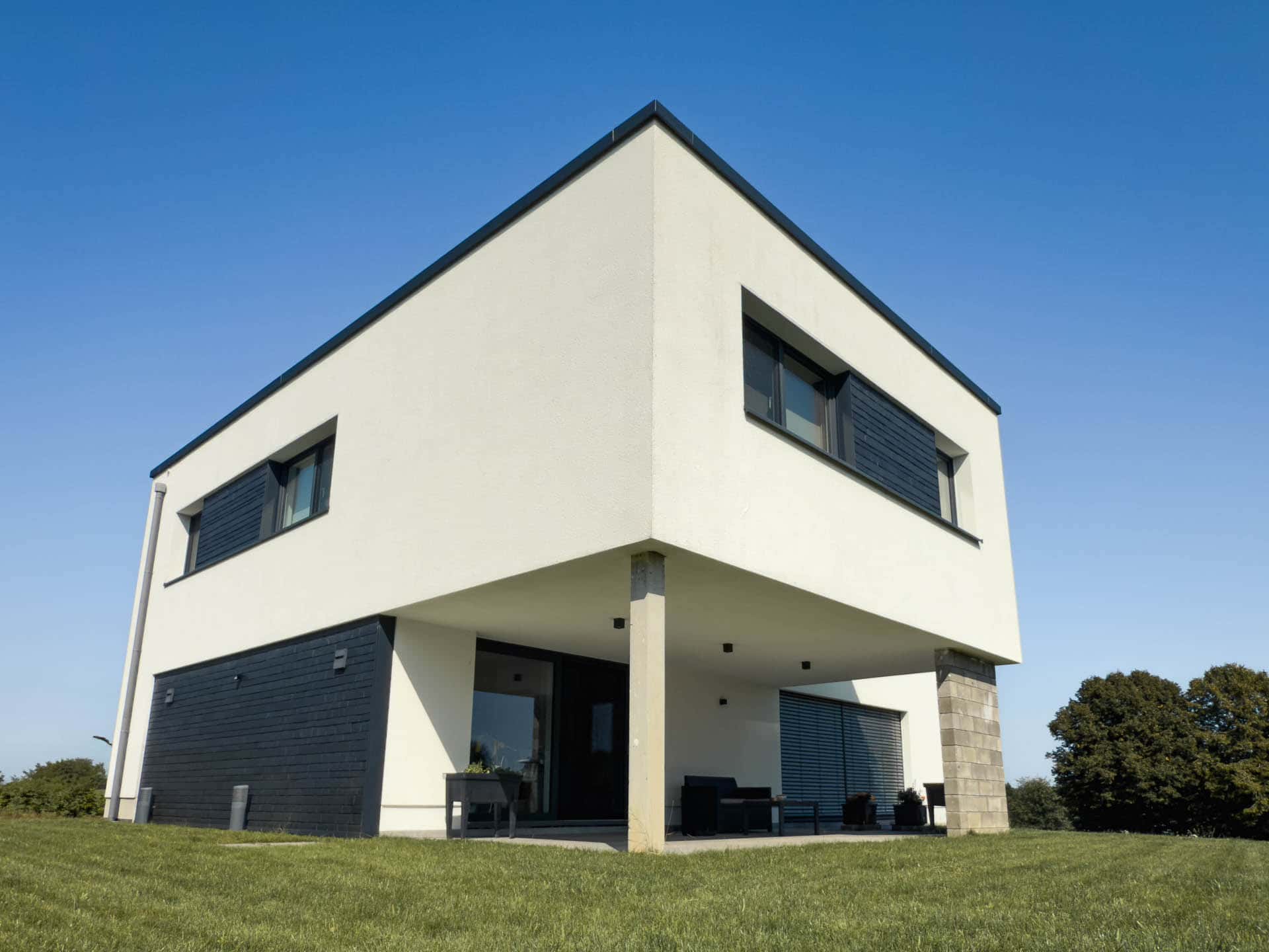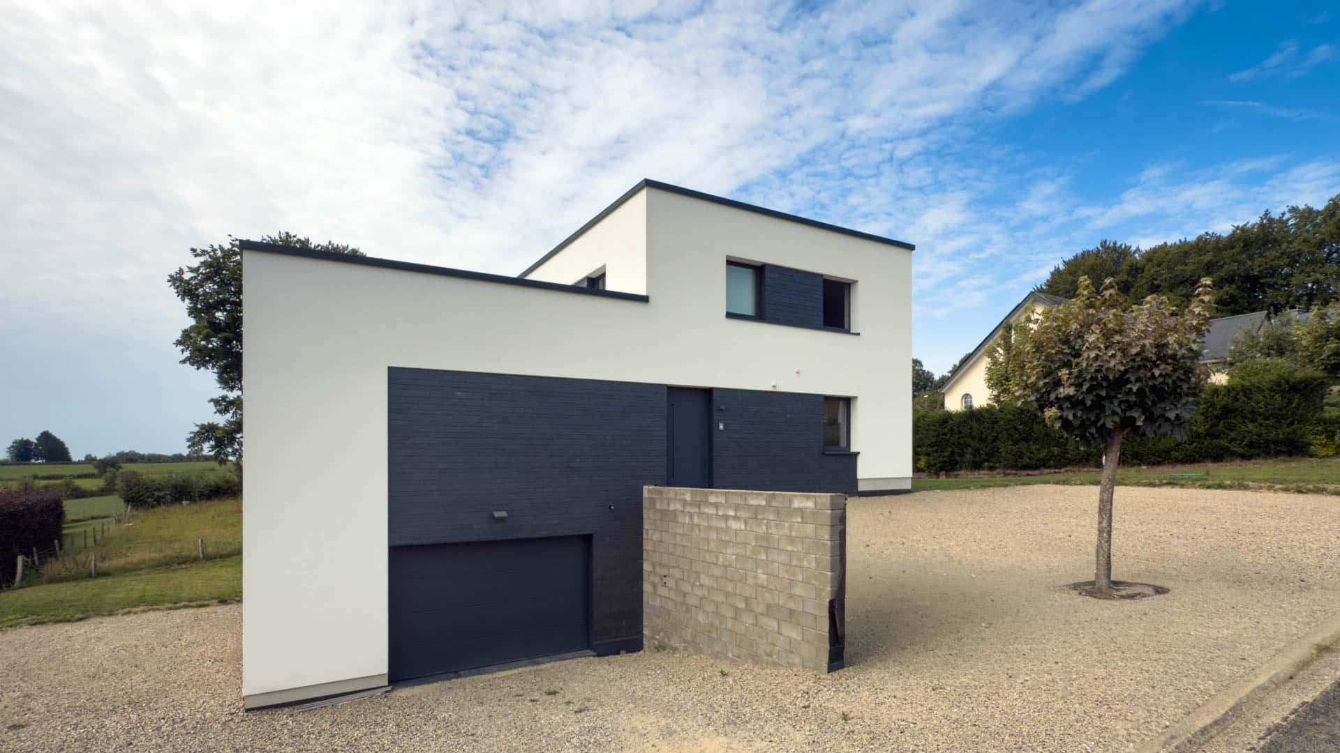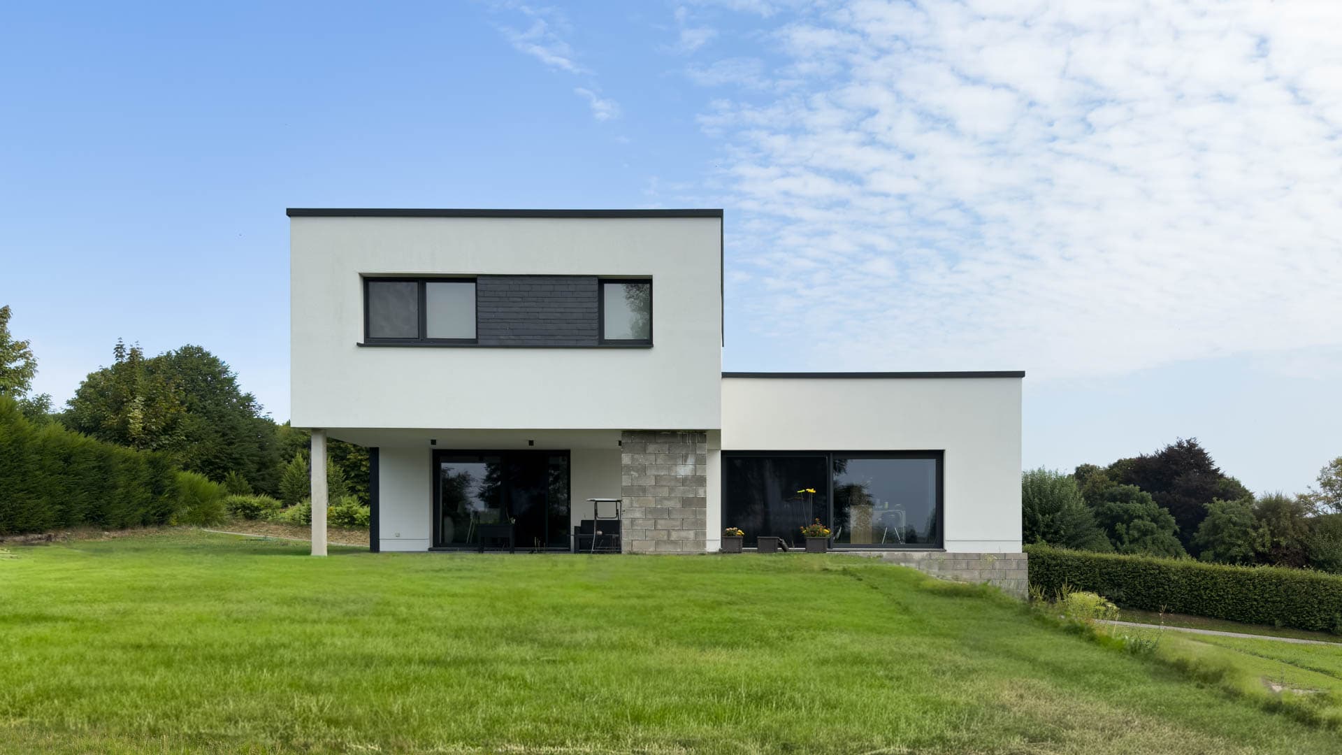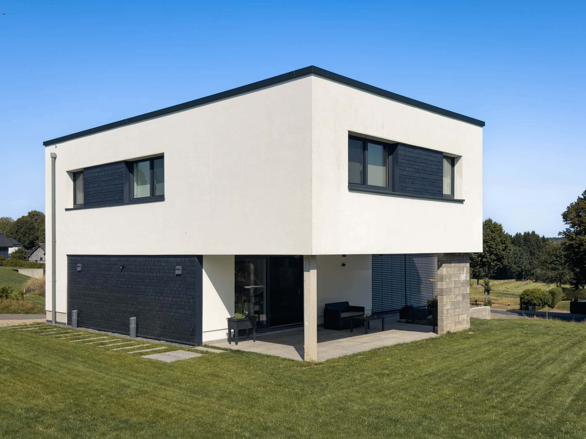 Das Wohnhaus fügt sich elegant in das steile Gelände ein. Garage und Haupteingang sind im Unter- bzw. Erdgeschoss positioniert und werden jeweils von einer klar konturierten, weiß verputzten Fläche gerahmt, sodass das Gebäude nicht als drei Etagen hoch wahrgenommen wird. Klare Kanten treffen präzise aufeinander, die Volumen sind sauber strukturiert und perfekt aufeinander abgestimmt. Die großzügig verglaste Rückfassade lässt viel Südwestlicht in die Wohnräume, während das versetzte Obergeschoss zugleich eine überdachte Terrasse schafft, die vor Regen schützt und das Innere vor Überhitzung bewahrt.