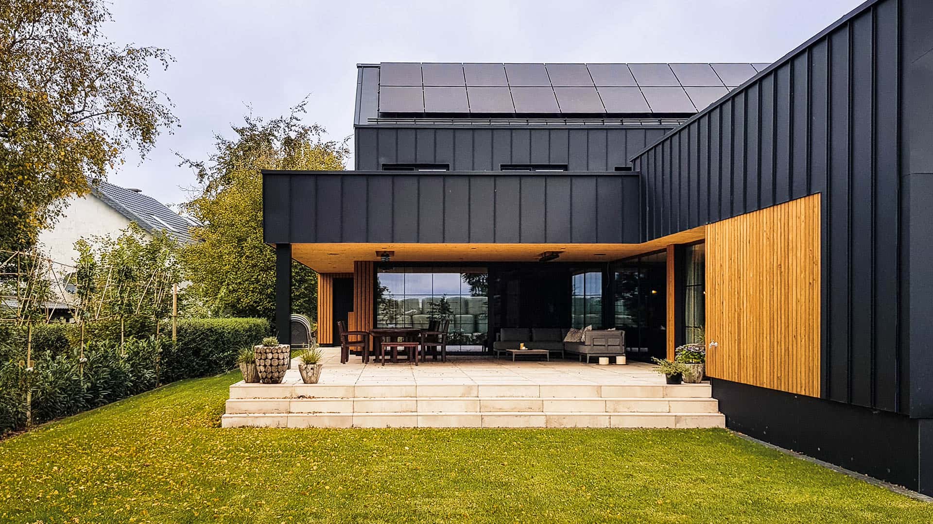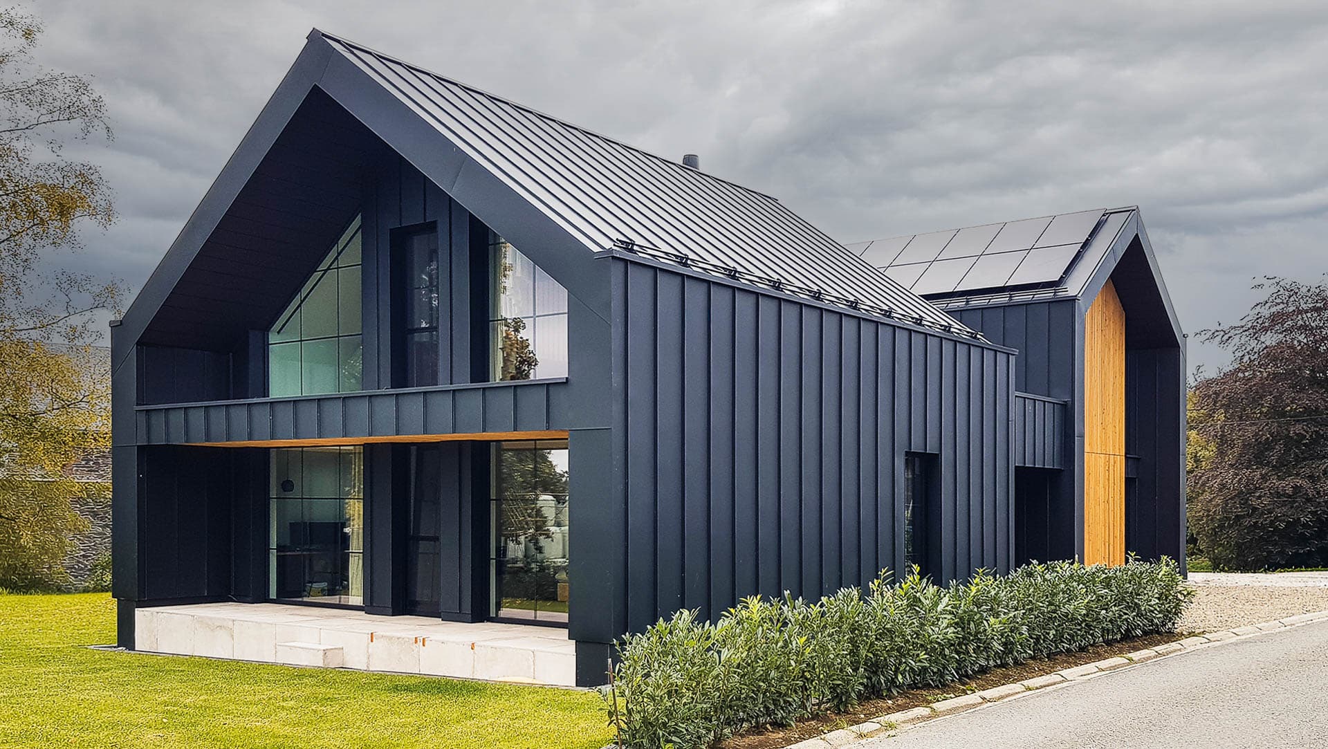 Zusammenspiel von zwei Satteldachvolumen, schwarz und elegant.