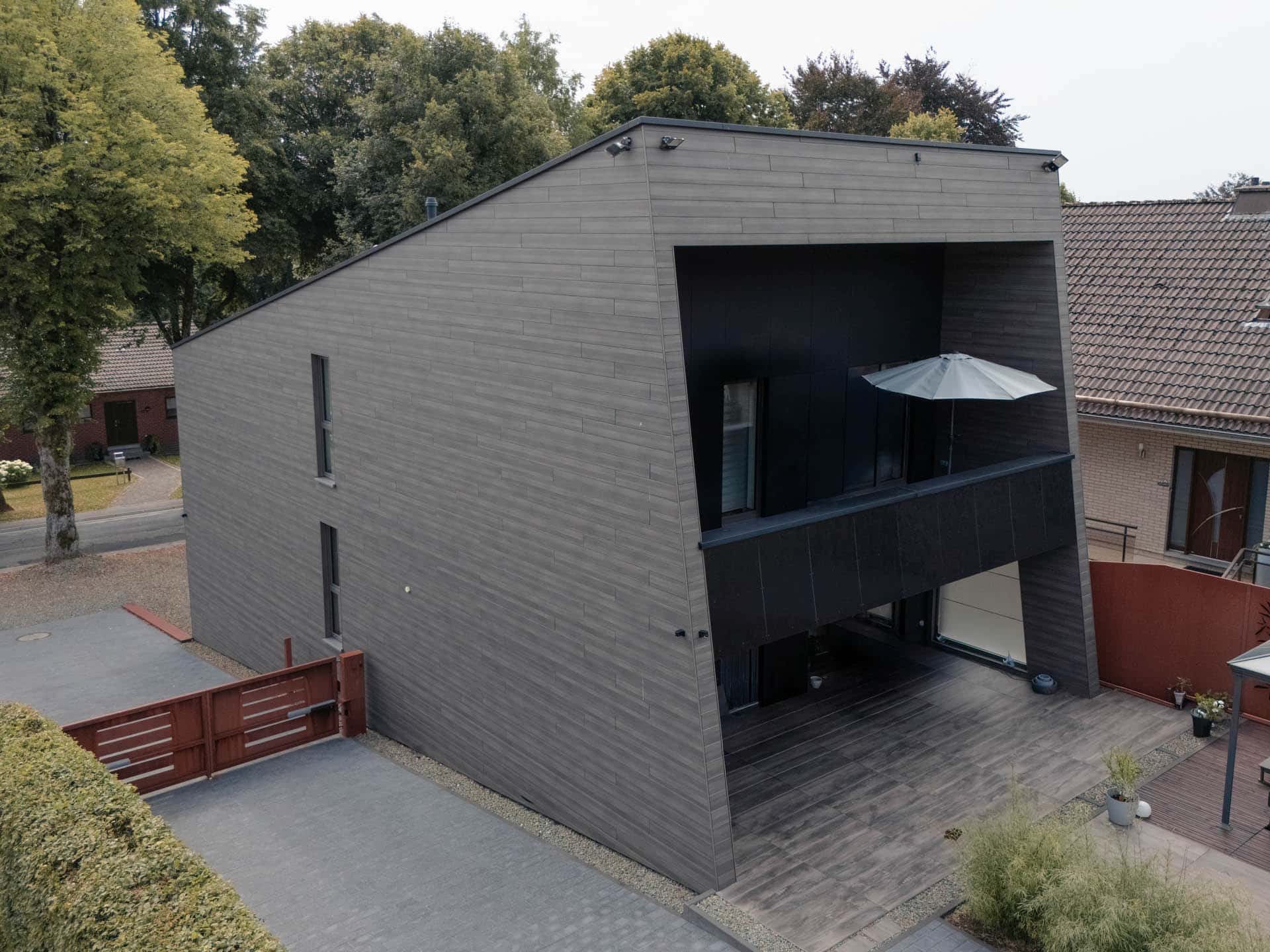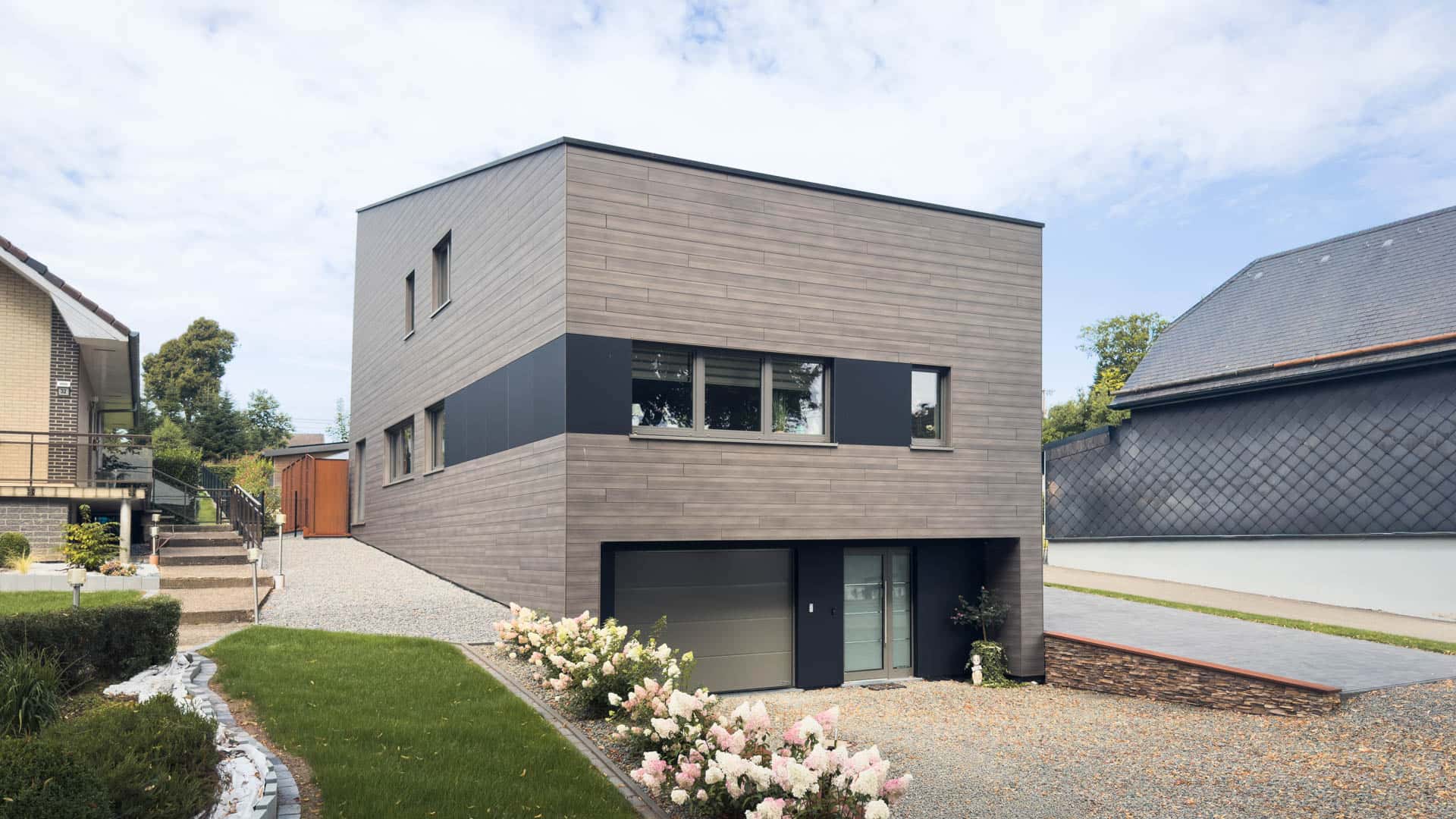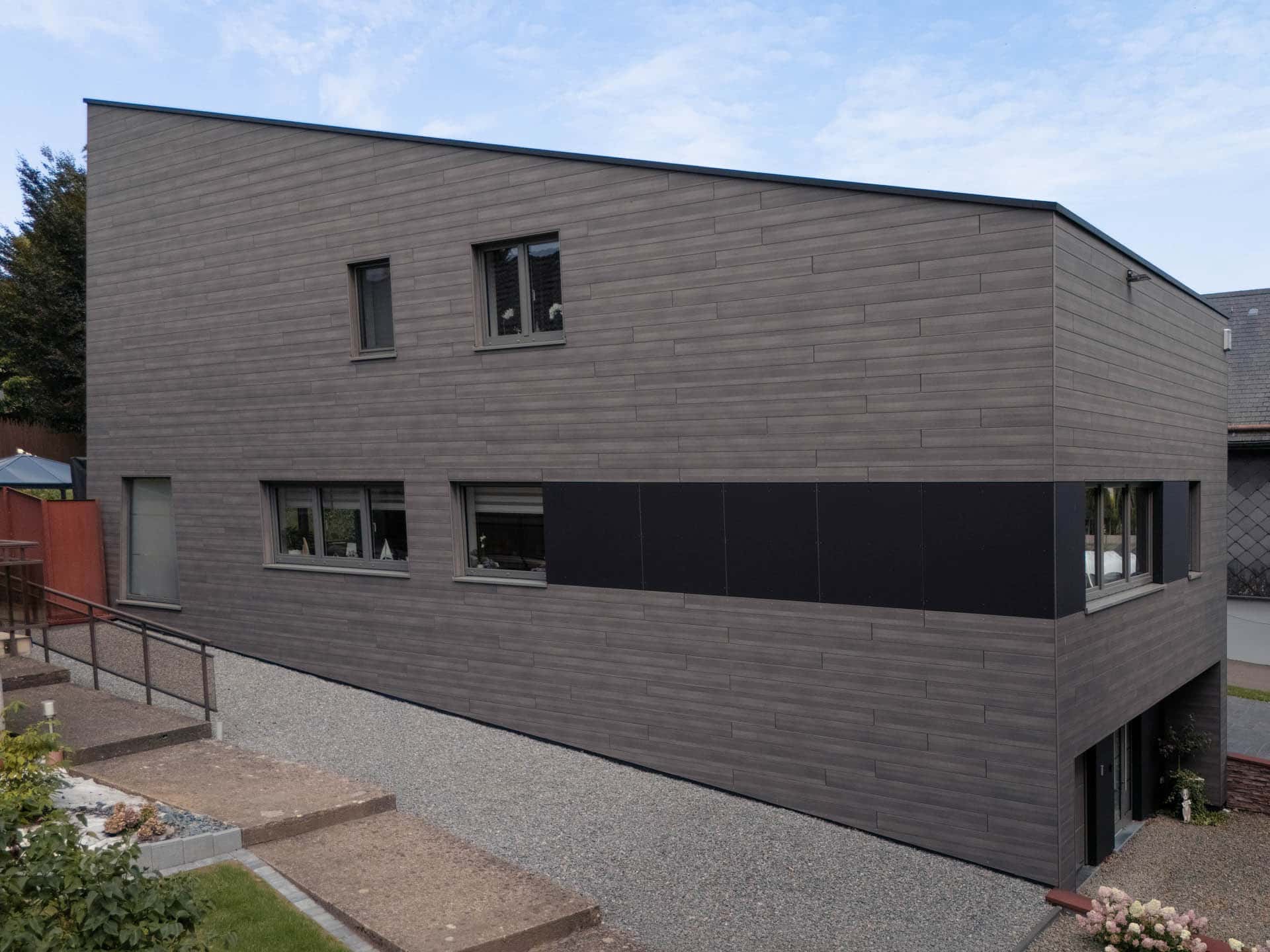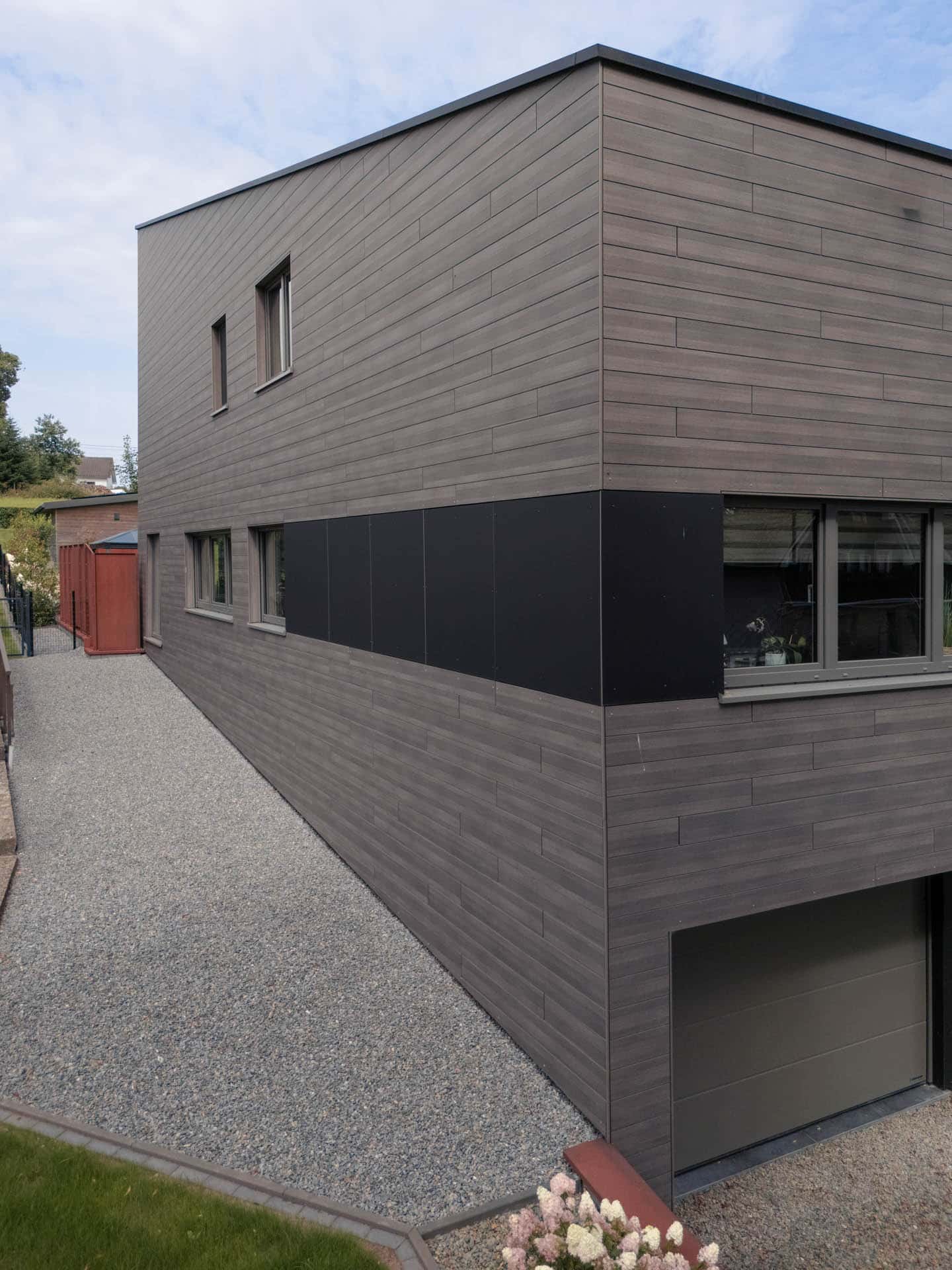 Eine horizontale Holzbekleidung umspannt das gesamte Gebäude, einschließlich Terrasse und Balkon. Diese werden dadurch überdacht und geschützt, bleiben jedoch offen zum Garten und verstärken den harmonischen Gesamteindruck.
