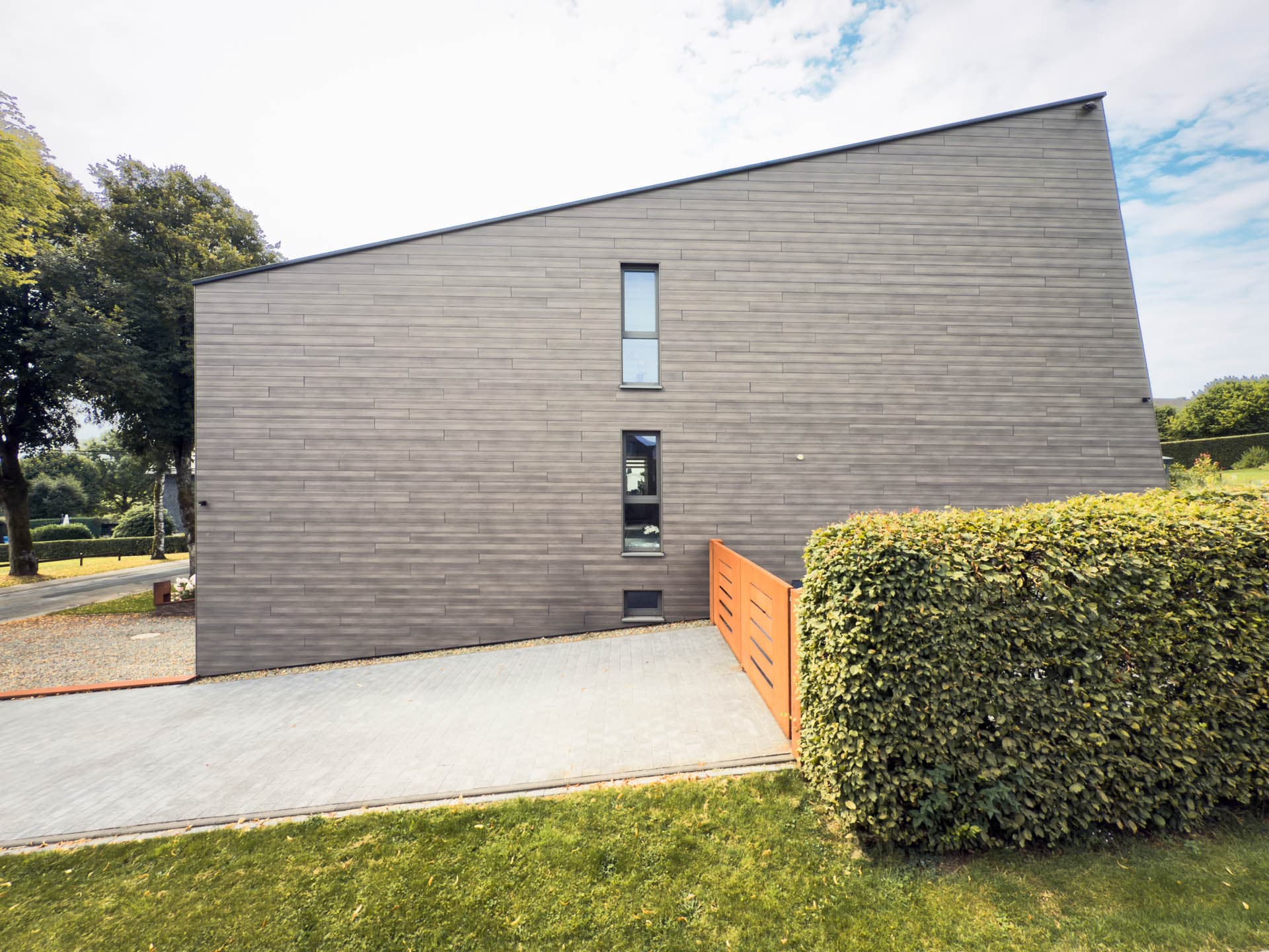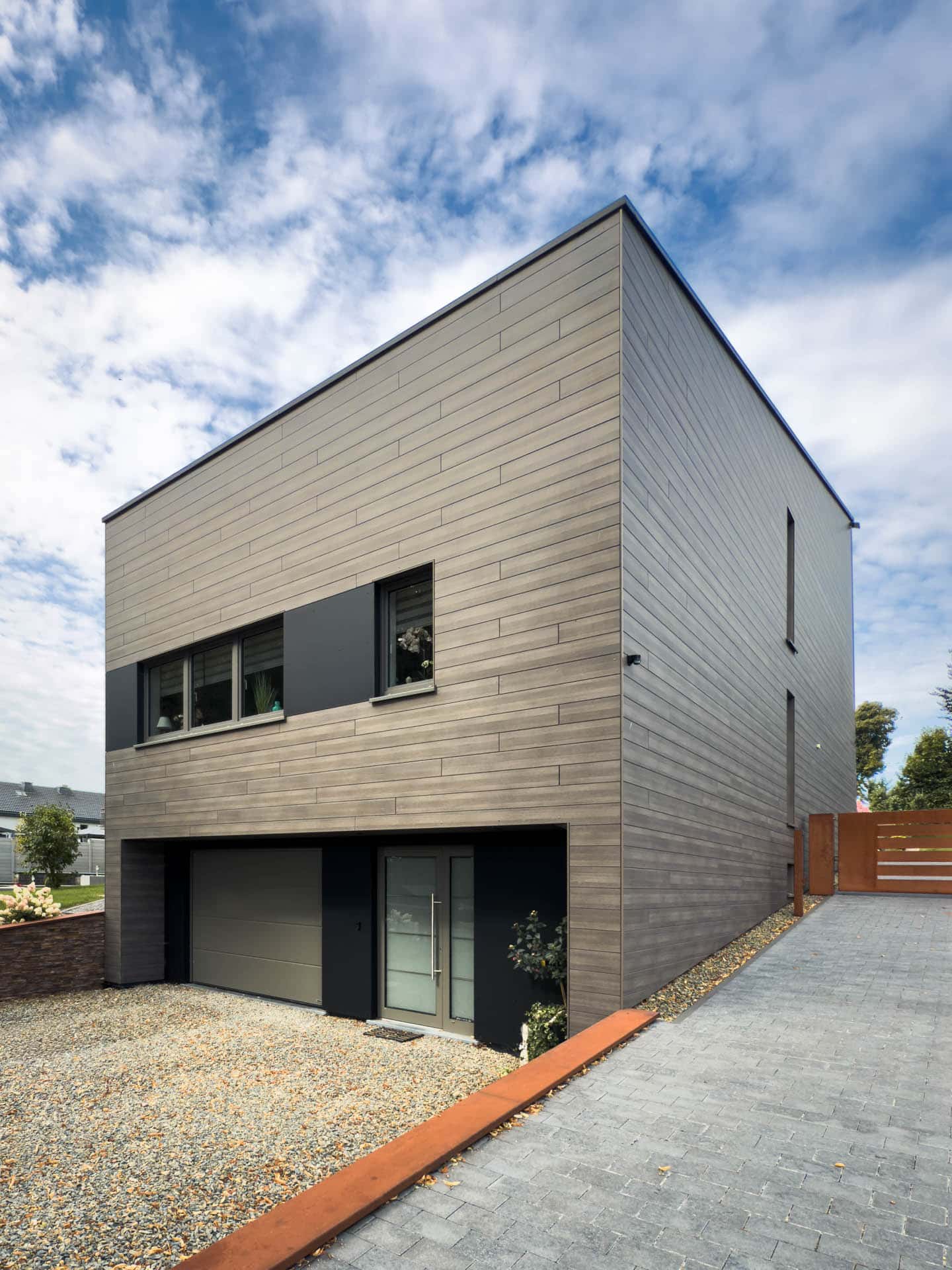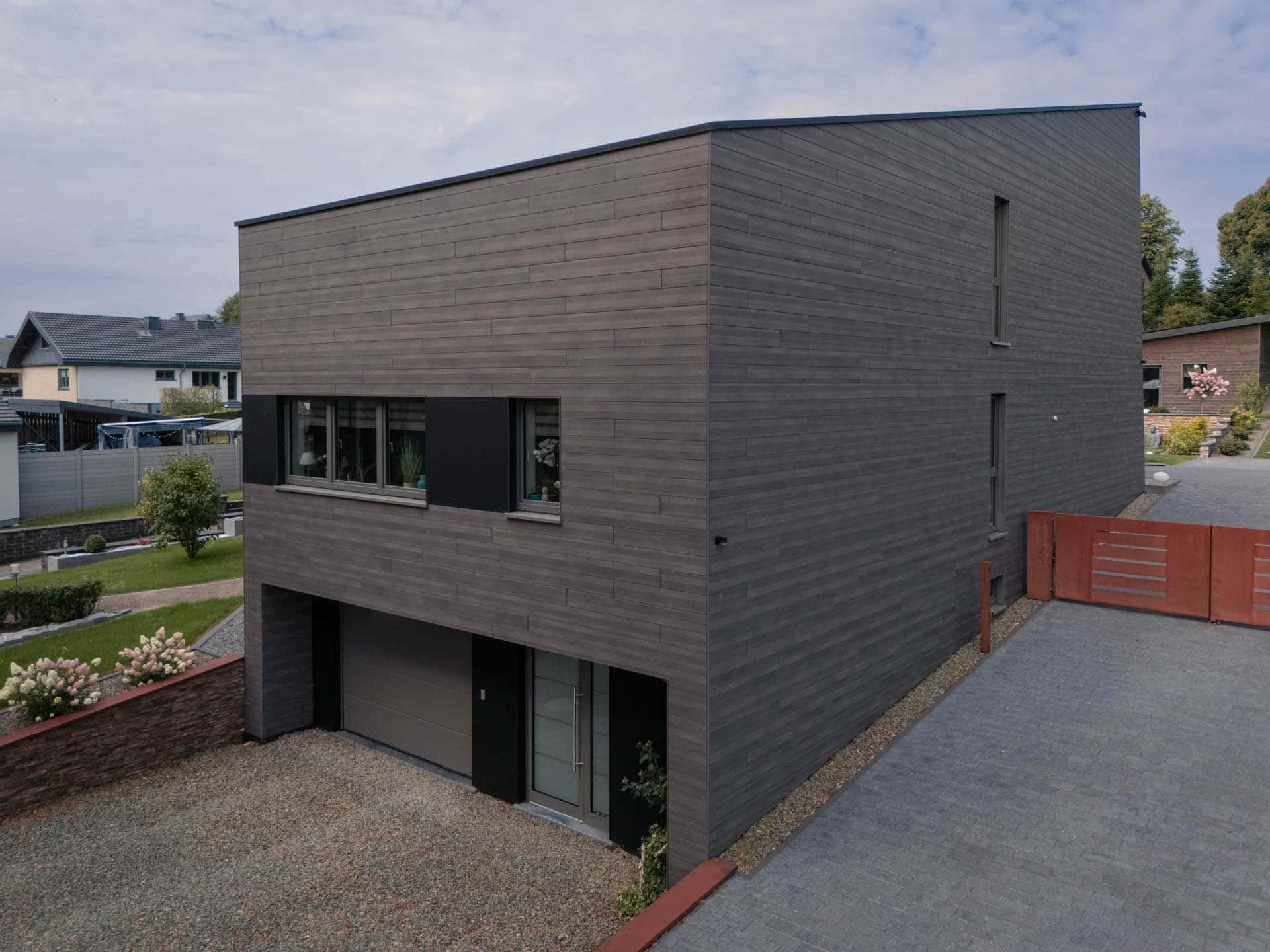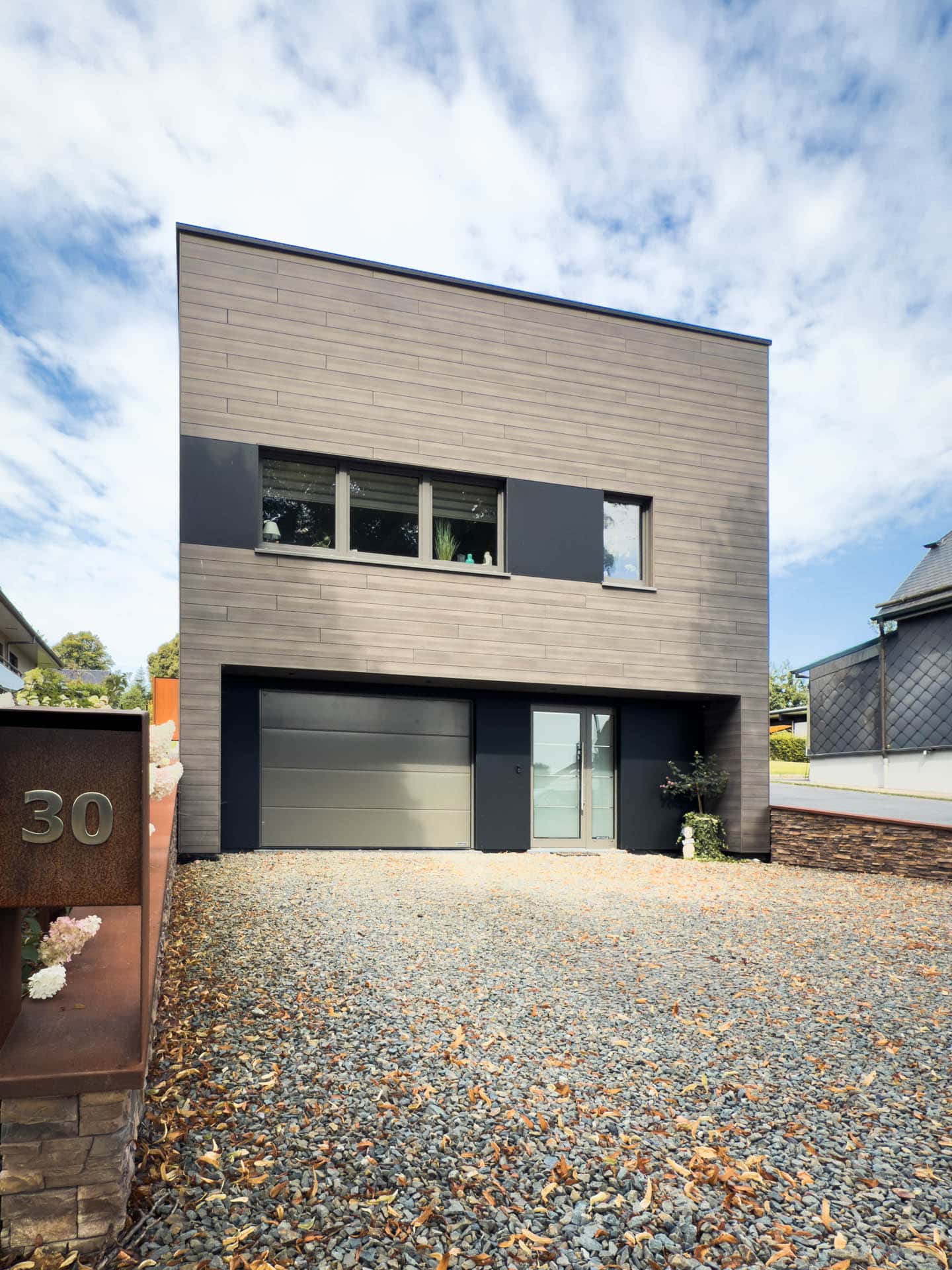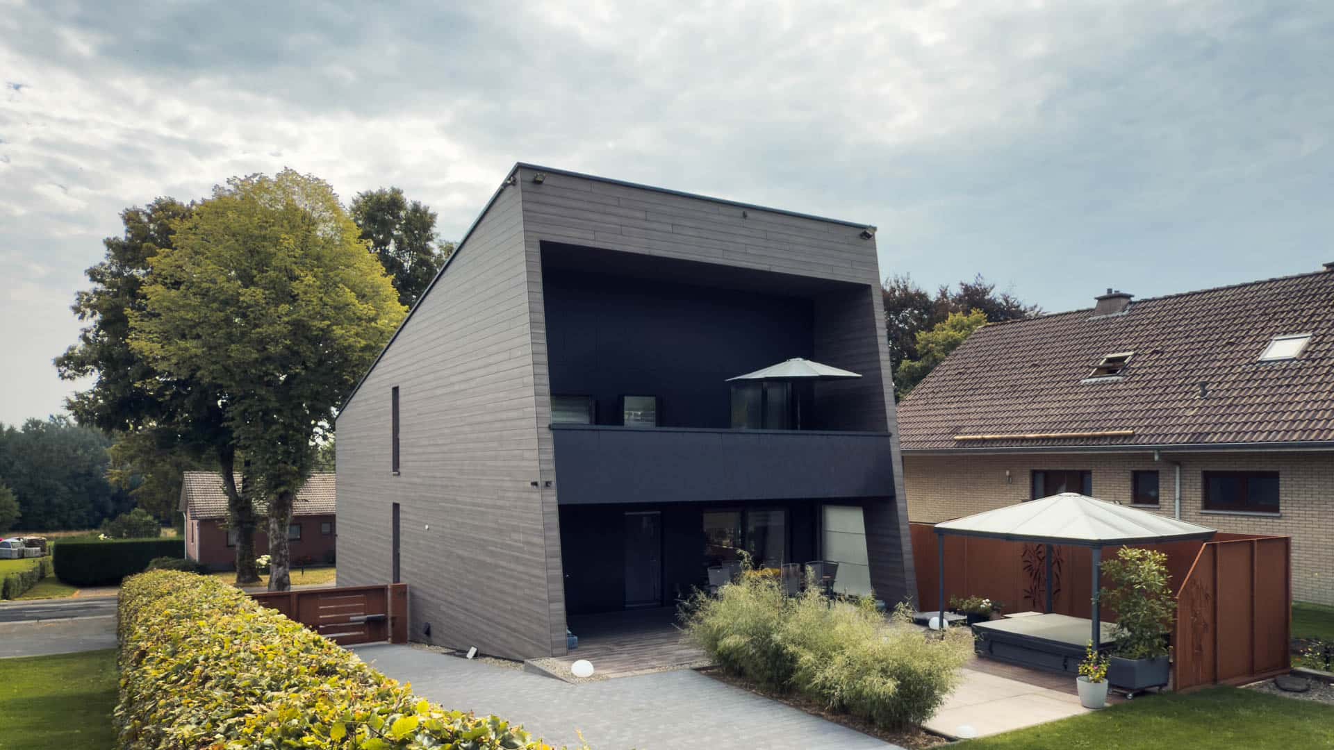 Eine horizontale Holzbekleidung umspannt das gesamte Gebäude, einschließlich Terrasse und Balkon. Diese werden dadurch überdacht und geschützt, bleiben jedoch offen zum Garten und verstärken den harmonischen Gesamteindruck.