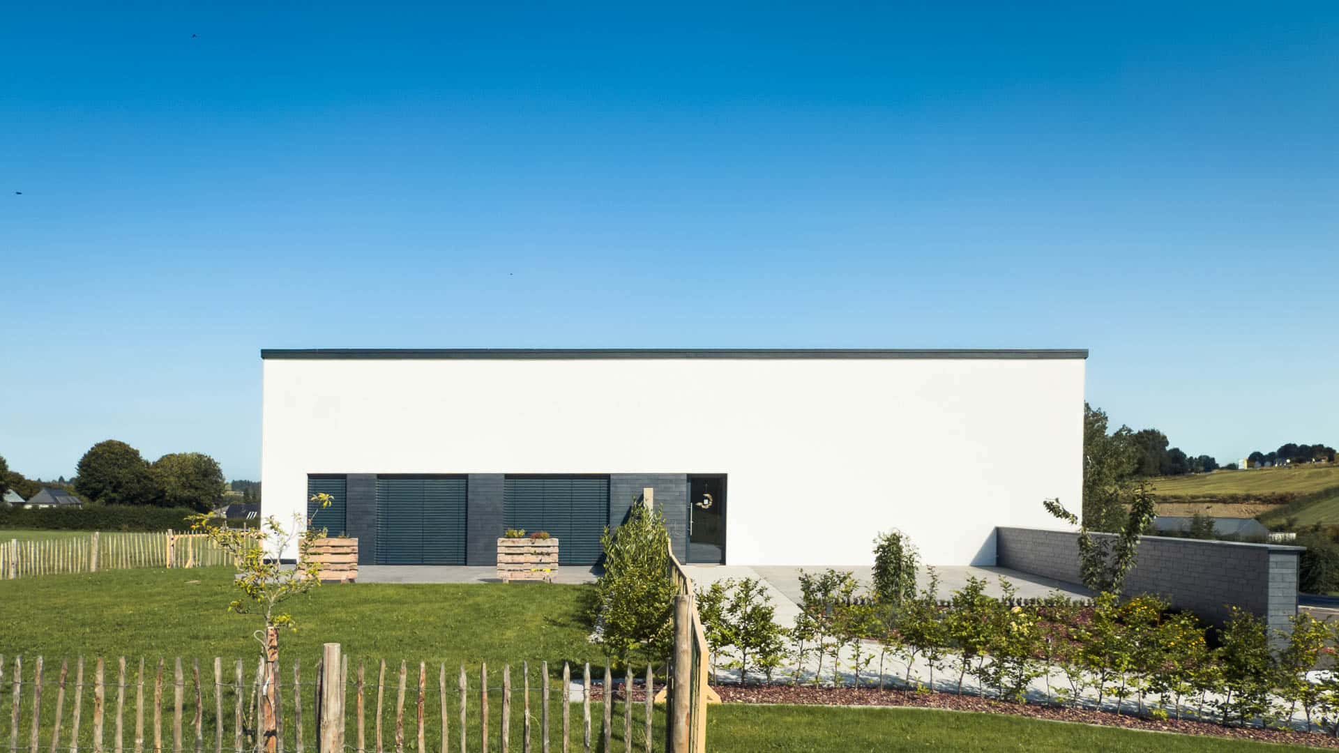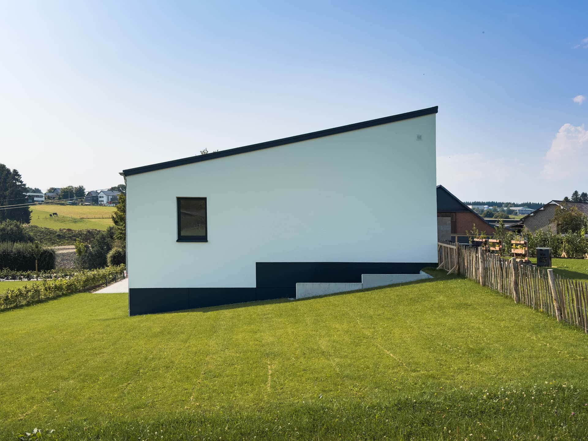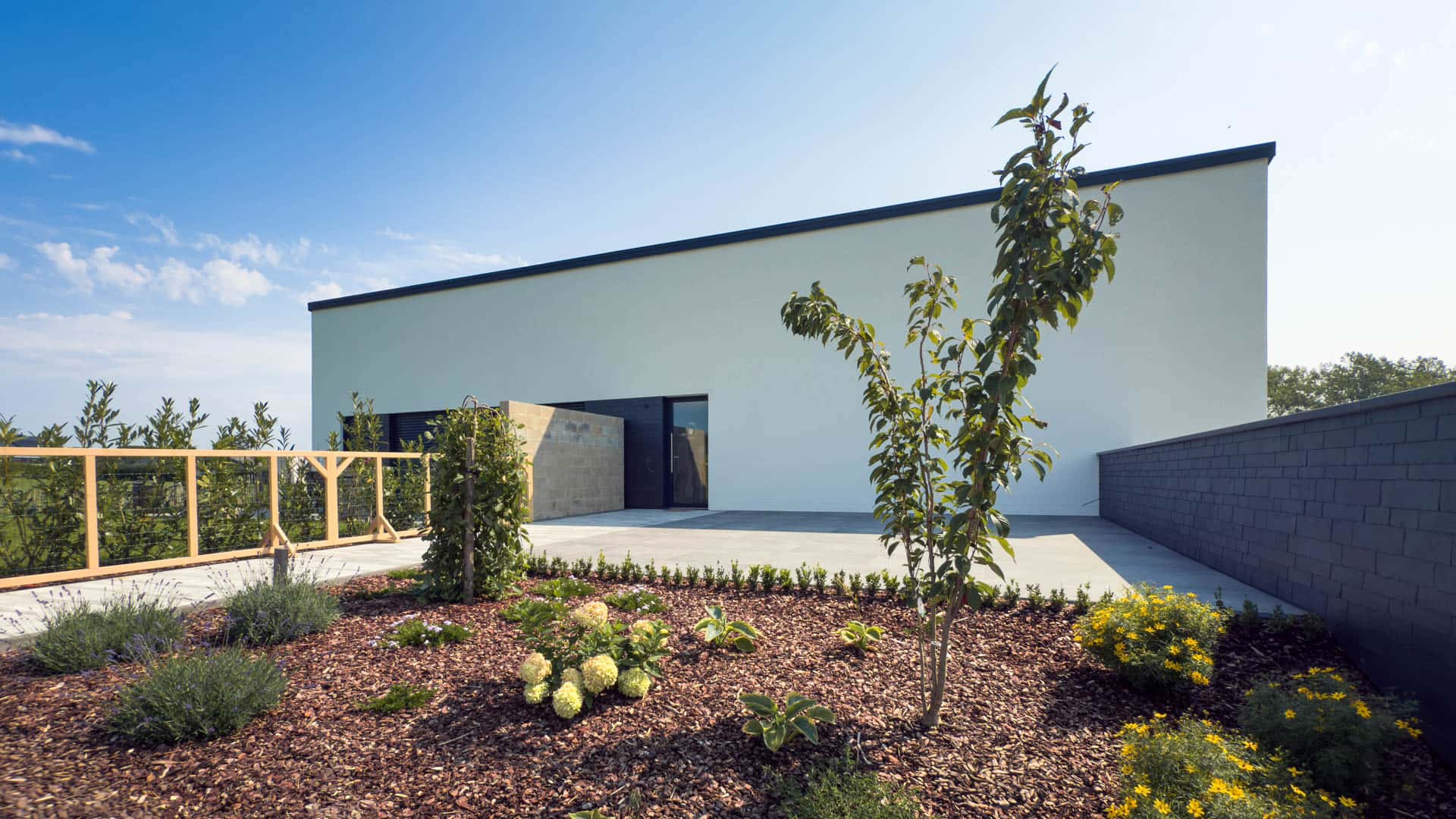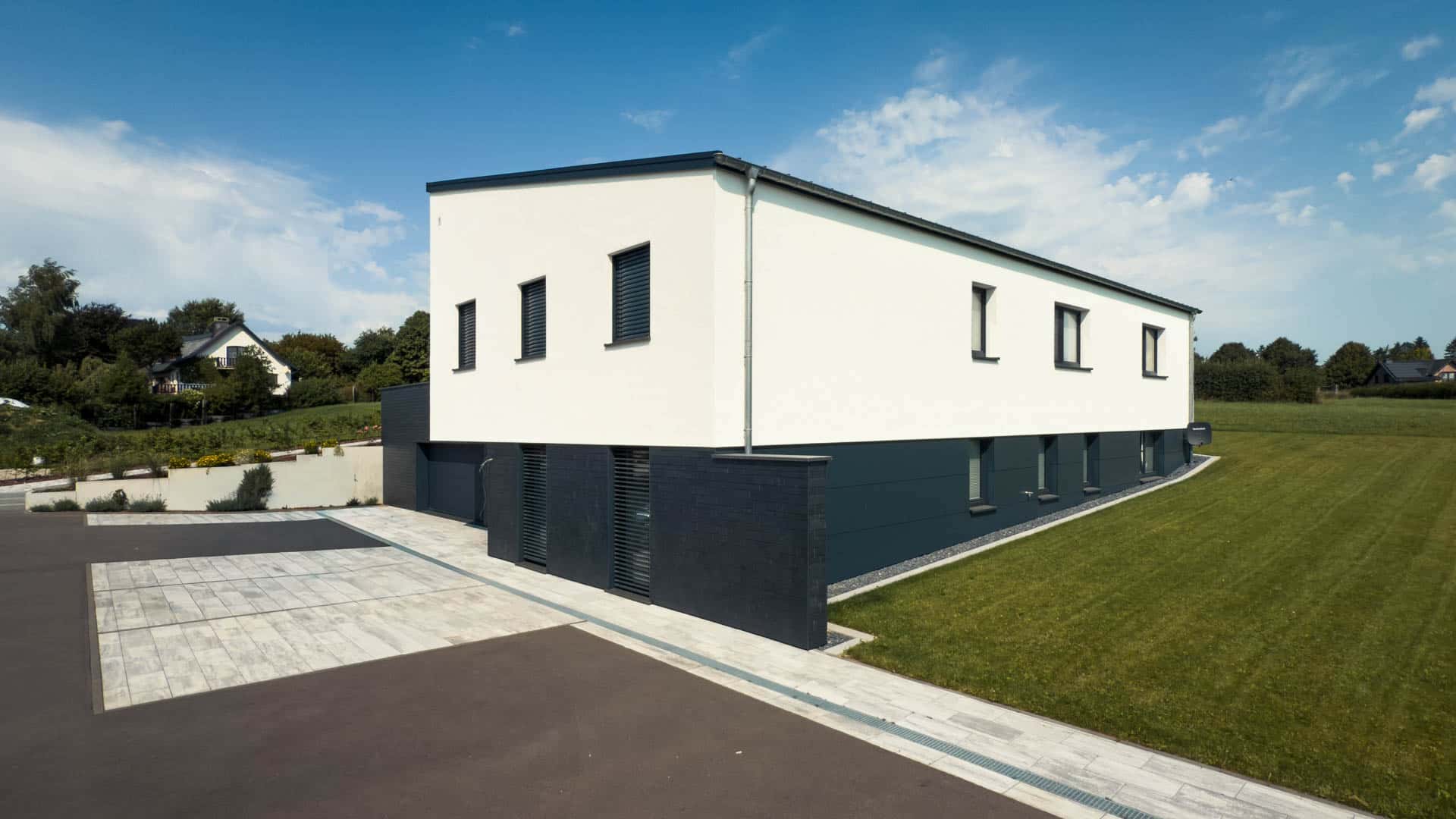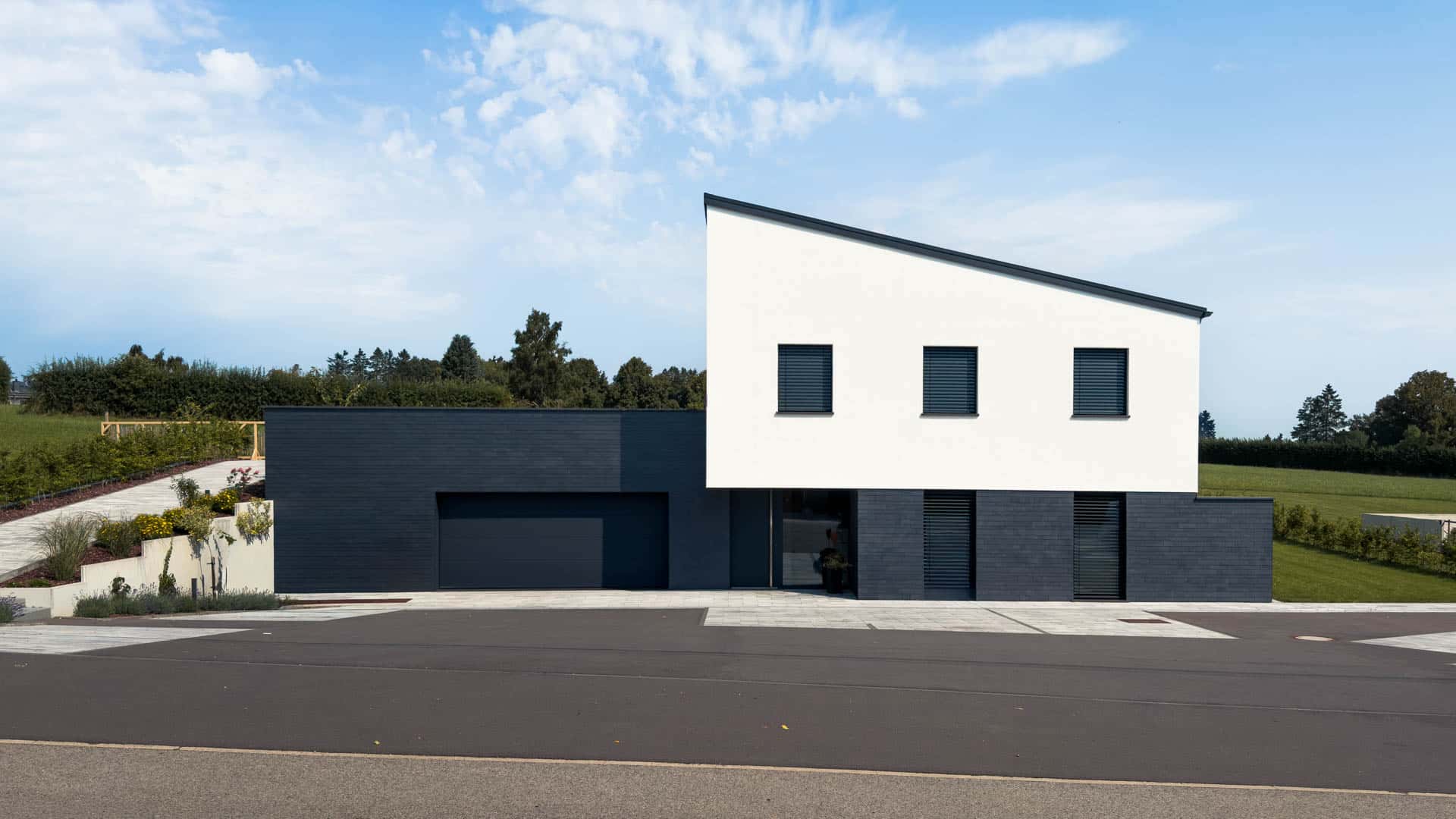 Die reduzierte Kubatur, der Kontrast von dunklem Sockel und hellem Obergeschoss sowie die geradlinige Außenraumgestaltung verleihen dem Projekt eine zeitlose, moderne Präsenz.