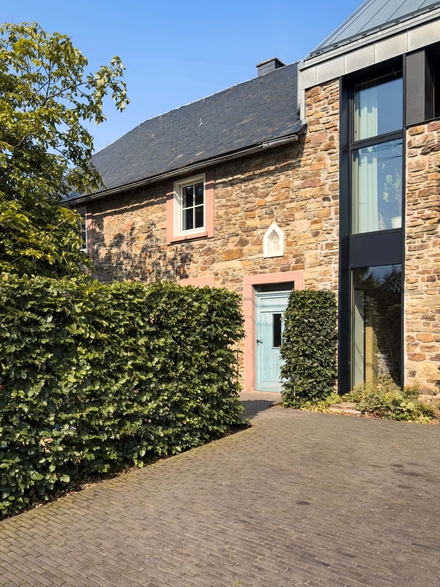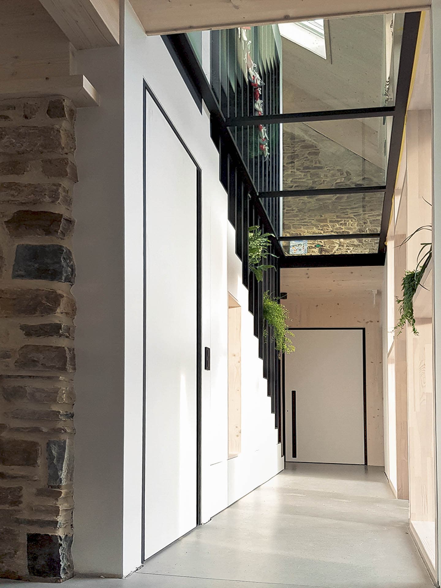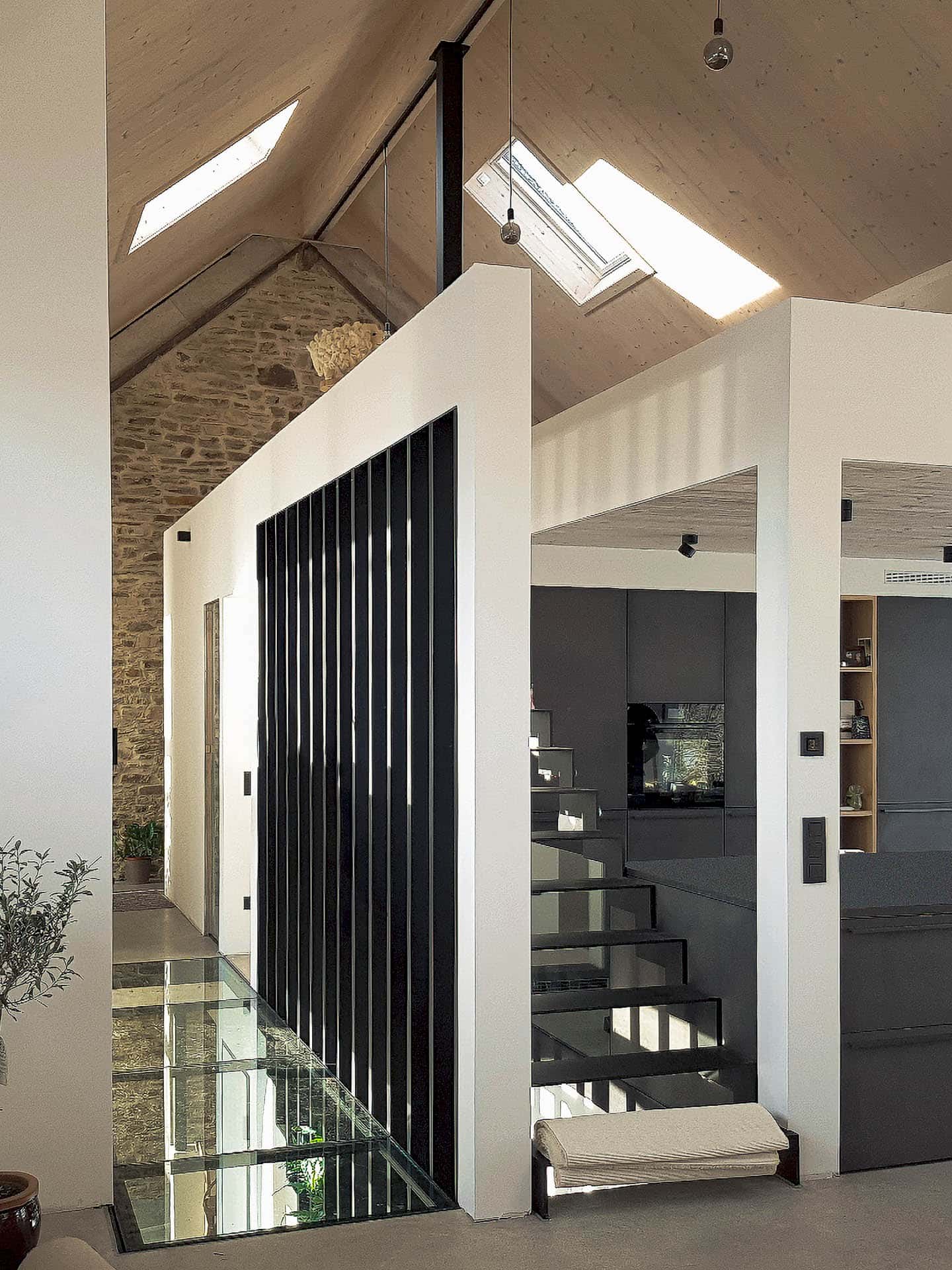 Altbekannte Strukturen treffen auf eine zeitgemäße Materialwahl. Der Eingang erfolgt durch das große Scheunentor – einst für Heuwagen, heute Zugang zu einer Praxis im Erdgeschoss. Im Obergeschoss öffnet sich ein großzügiger Wohnbereich, dessen Funktionen in einem zentralen Möbel gebündelt sind, das wie eine skulpturale Struktur unter dem Satteldach aufragt. Die Bruchsteinwände blieben bewusst erhalten und werden durch moderne Elemente aus schwarzem Metall, Glas, Sichtholz und hochwertigen Schichtplatten ergänzt – ein Dialog zwischen Bestand und zeitgenössischer Interpretation.
