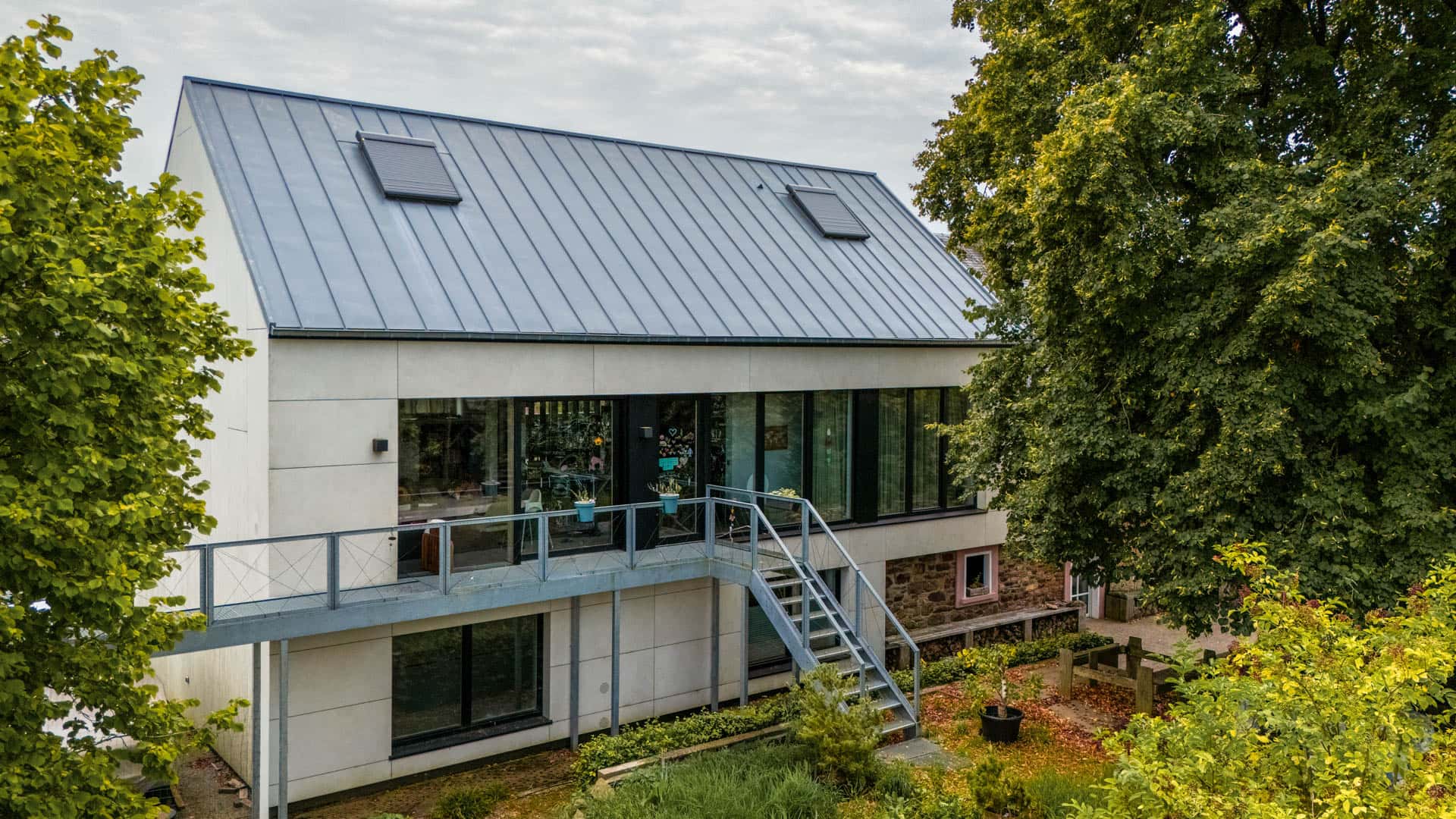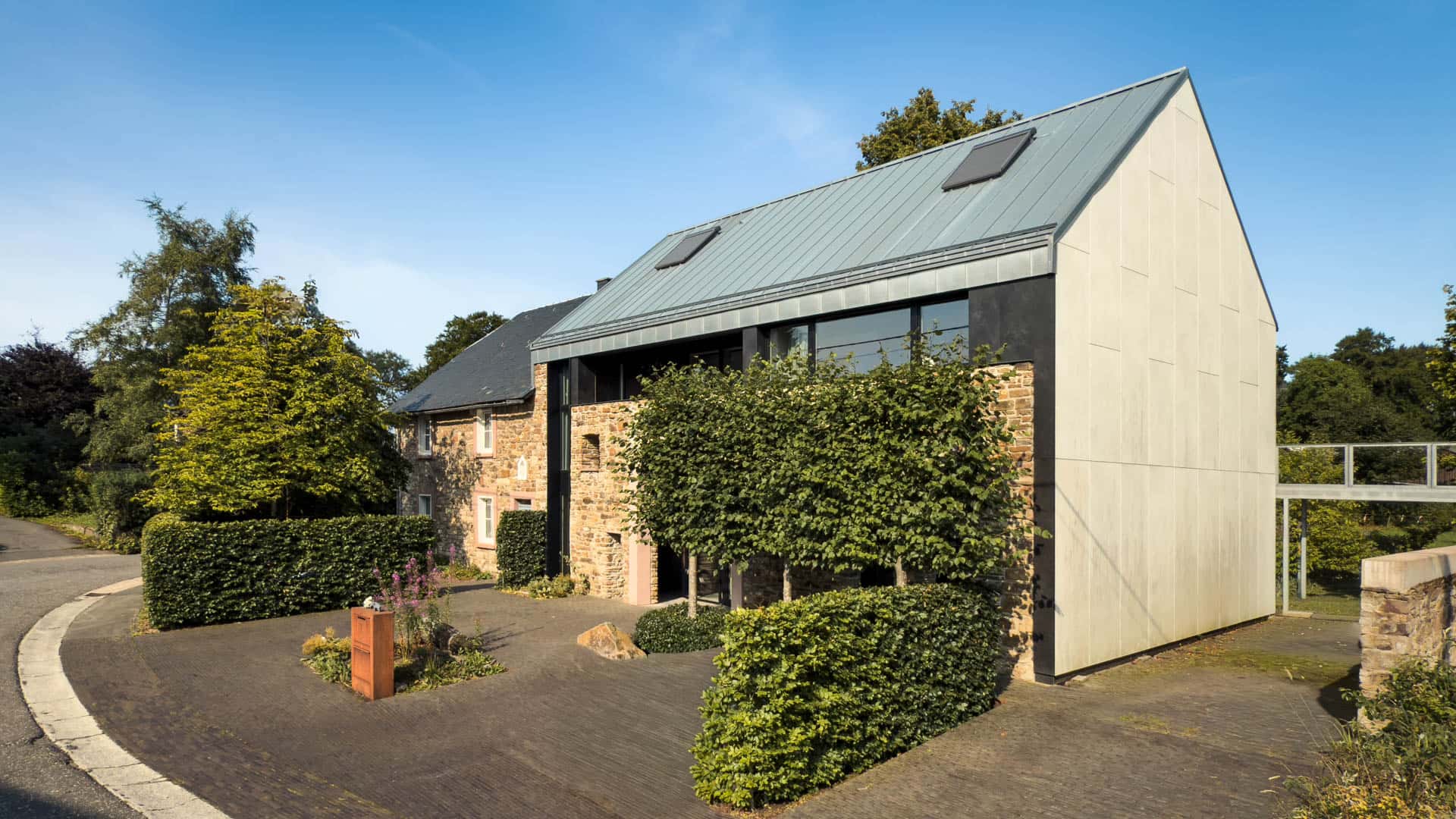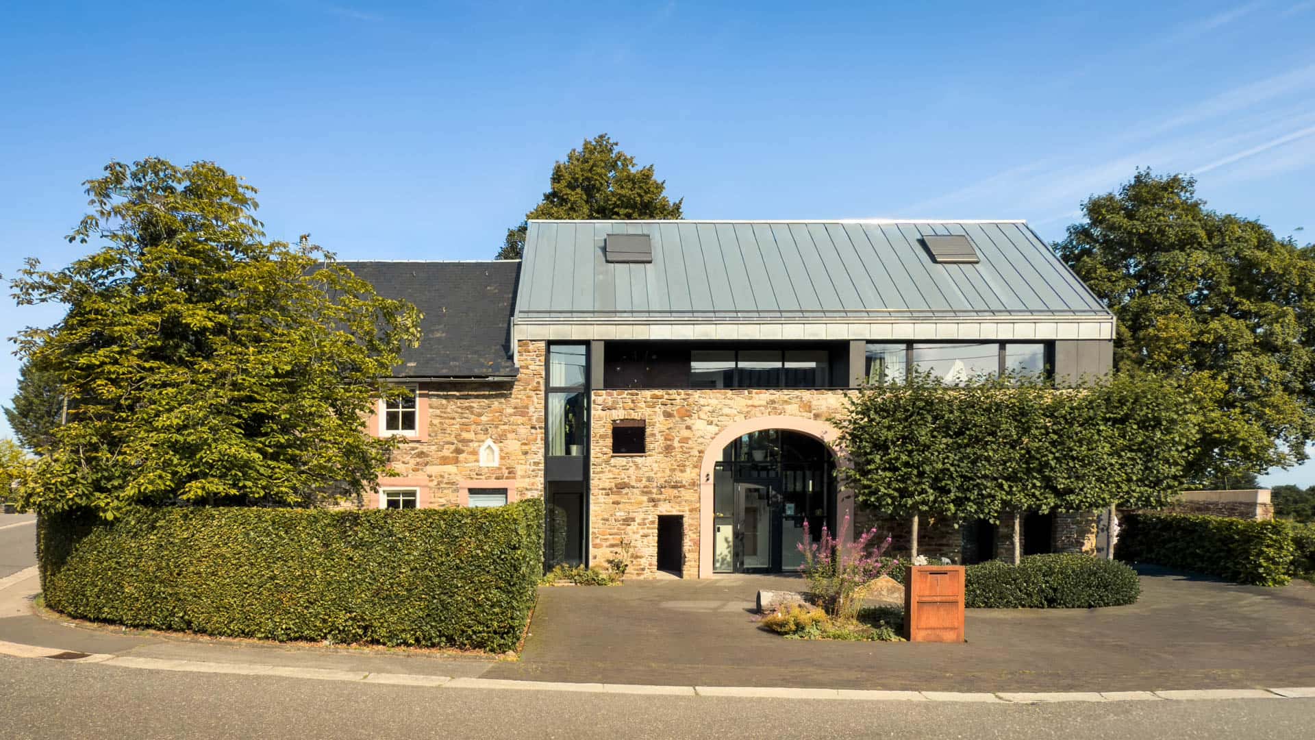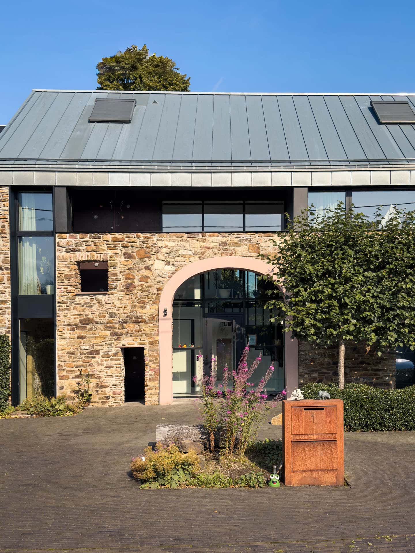 Altbekannte Strukturen treffen auf eine zeitgemäße Materialwahl. Der Eingang erfolgt durch das große Scheunentor – einst für Heuwagen, heute Zugang zu einer Praxis im Erdgeschoss. Im Obergeschoss öffnet sich ein großzügiger Wohnbereich, dessen Funktionen in einem zentralen Möbel gebündelt sind, das wie eine skulpturale Struktur unter dem Satteldach aufragt. Die Bruchsteinwände blieben bewusst erhalten und werden durch moderne Elemente aus schwarzem Metall, Glas, Sichtholz und hochwertigen Schichtplatten ergänzt – ein Dialog zwischen Bestand und zeitgenössischer Interpretation.